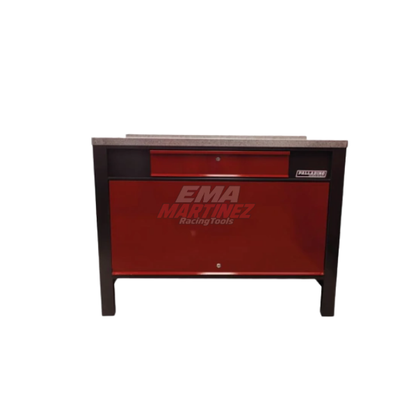 Su estructura metálica reforzada y mesada de chapa galvanizada permiten realizar tareas exigentes con seguridad. La combinación de cajón con cerradura y compartimiento con puerta rebatible brinda una organización eficiente para herramientas e insumos.