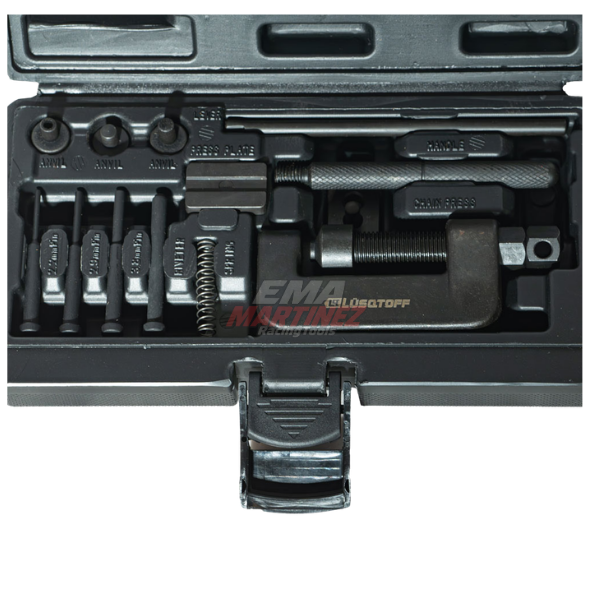 Fabricado en acero al carbono de alta resistencia, permite cortar, prensar y remachar eslabones de forma segura y eficiente. Su diseño robusto y ergonómico garantiza un uso cómodo y resultados profesionales tanto en talleres como en uso particular.