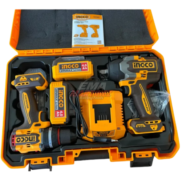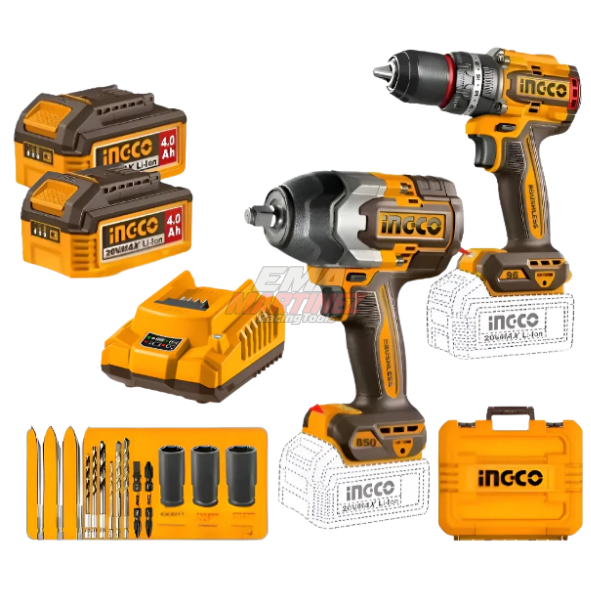 El Ingco COSLI250586-4 es un kit combo inalámbrico profesional de la línea P20S, que incluye un taladro atornillador percutor brushless de 96 Nm y una llave de impacto de alto torque de 850 Nm.