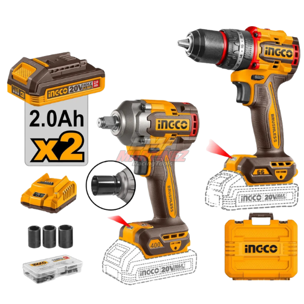 El Kit Ingco CKLI20275-4 es un combo profesional que incluye taladro percutor y llave de impacto inalámbrica, ideal para trabajos de mantenimiento, mecánica, montaje y uso industrial.