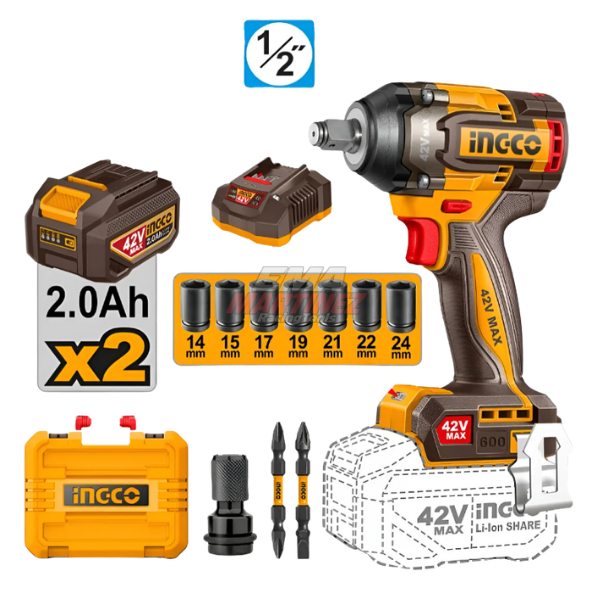La Ingco CIWLI42602-4 es una llave de impacto inalámbrica de alto rendimiento, diseñada para trabajos exigentes en mecánica automotriz, mantenimiento industrial y montaje de estructuras.