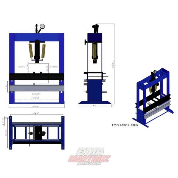 Su estructura de acero reforzado garantiza una mínima deflexión incluso bajo carga máxima, permitiendo realizar operaciones precisas sobre bujes, rodamientos y piezas estructurales. Cuenta con sistema de bombeo de doble etapa y válvula de seguridad, lo que asegura un funcionamiento eficiente y previene sobrecargas accidentales.